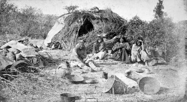 A group gathered outside of their cloth and brush-covered wickiup, ca. 1885. Photo taken by A.F. Randall. Courtesy of the Library of Congress.